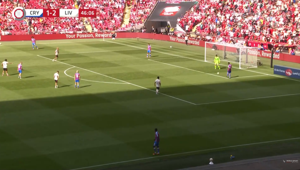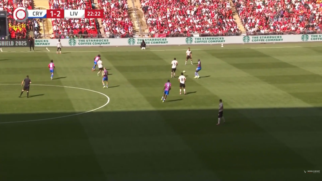 The nature of Slot’s high line can leave the Reds in a precarious position if the ball is lost in midfield, with Oliver Glasner’s side exploiting it several times on Sunday.